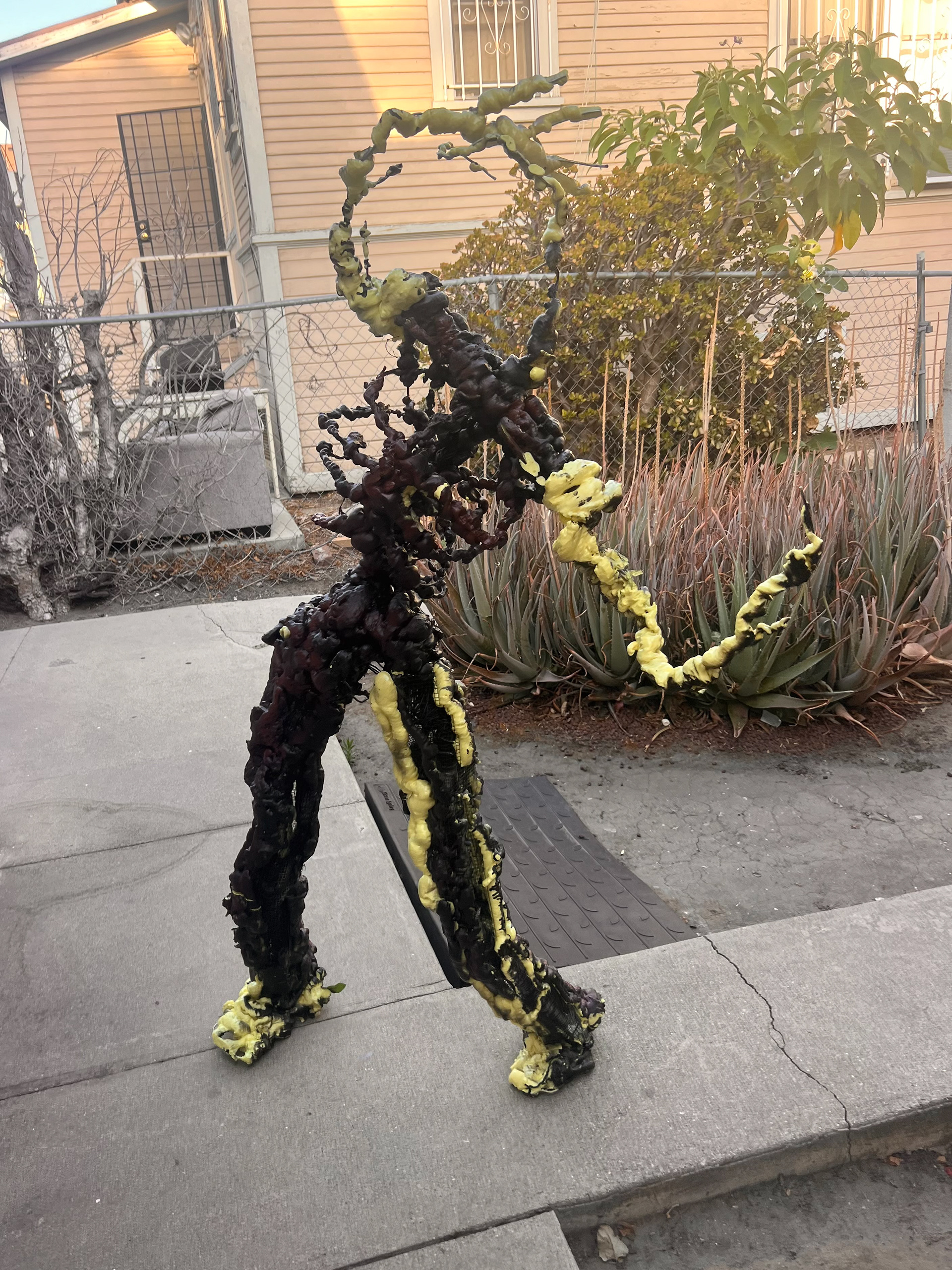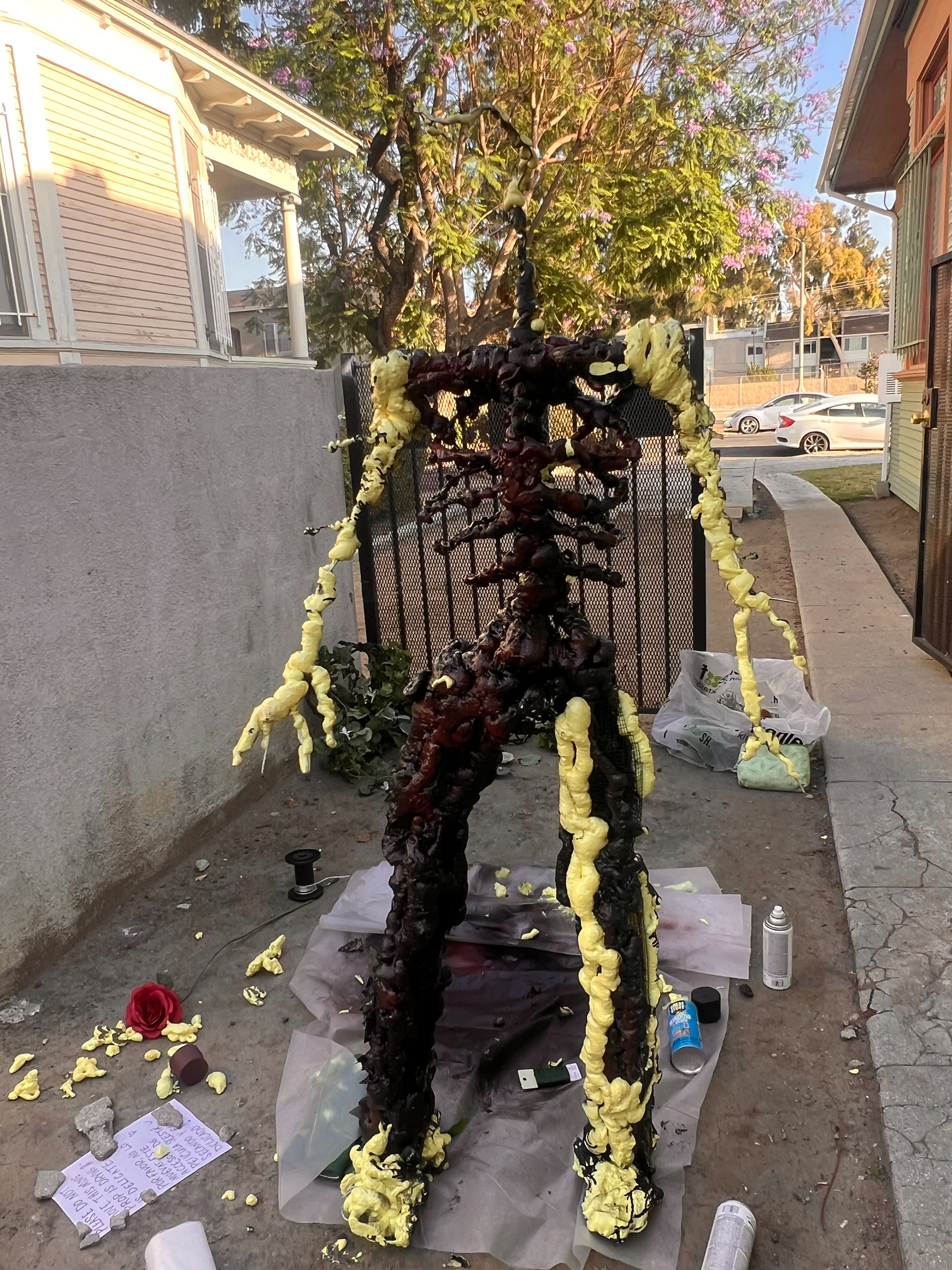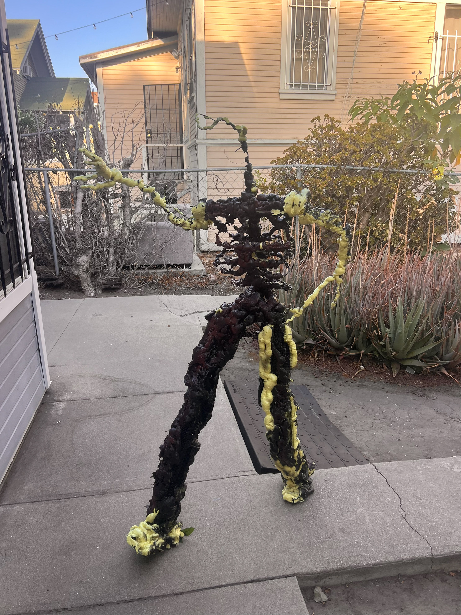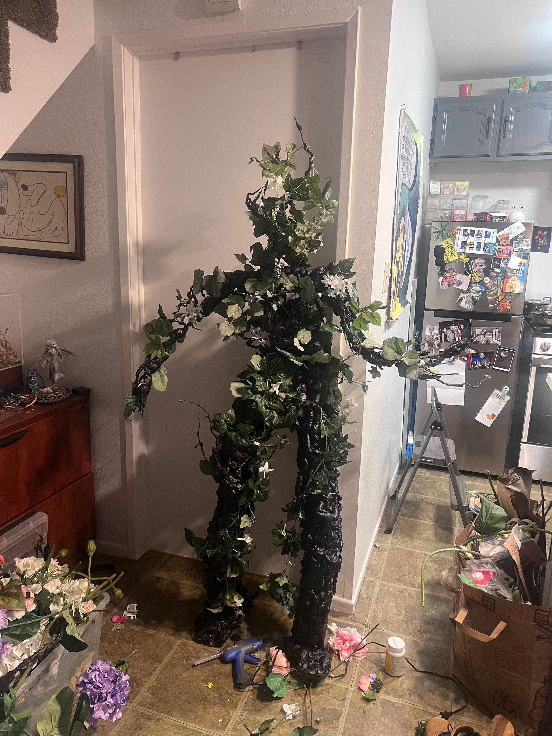 I built this life-sized animatable flower man, capable of sitting, standing, and dancing. It has an armature wire and chicken wire base, with low-expansion polyurethane foam, adorned a mixture and fake and real foliage.