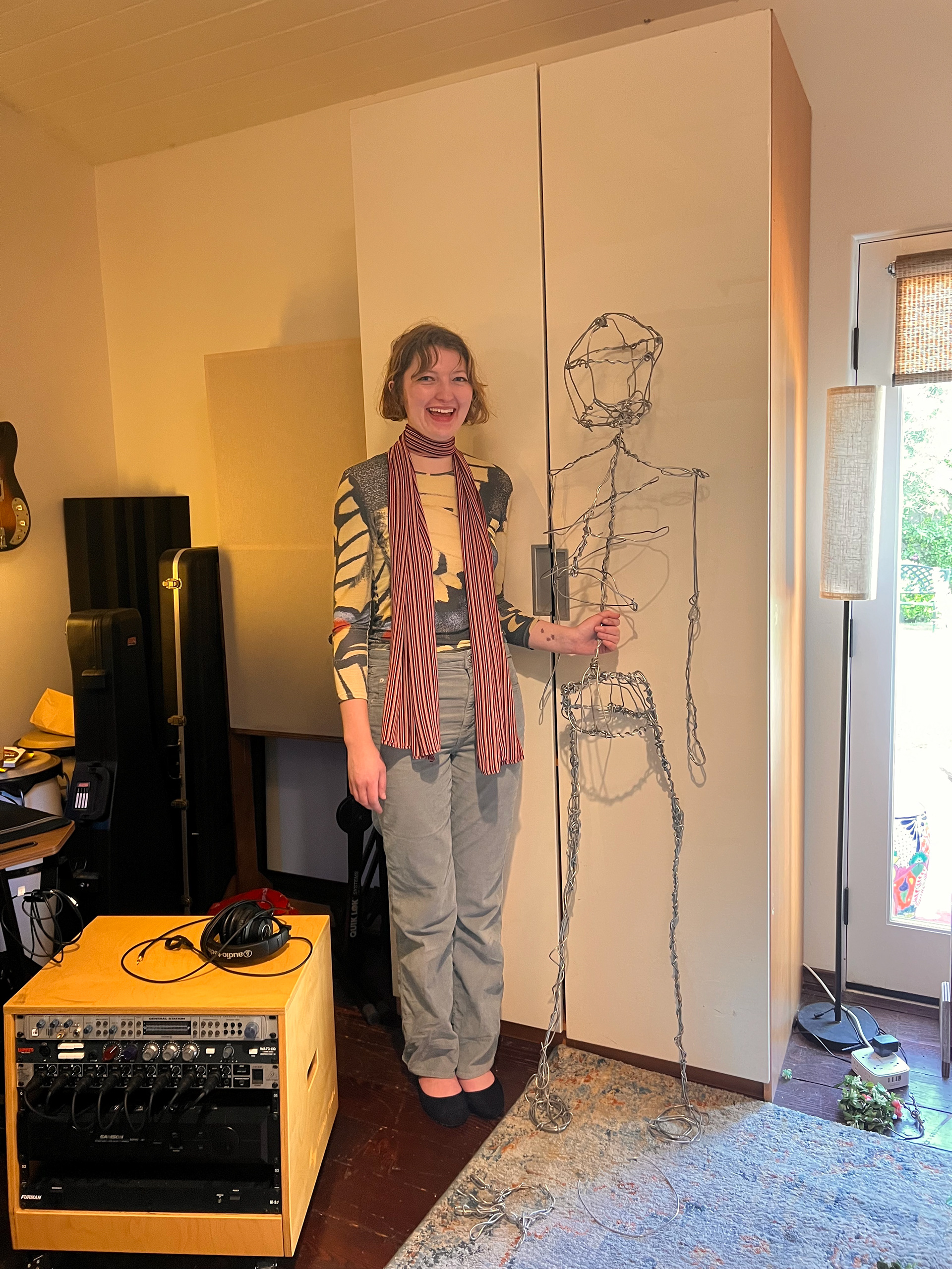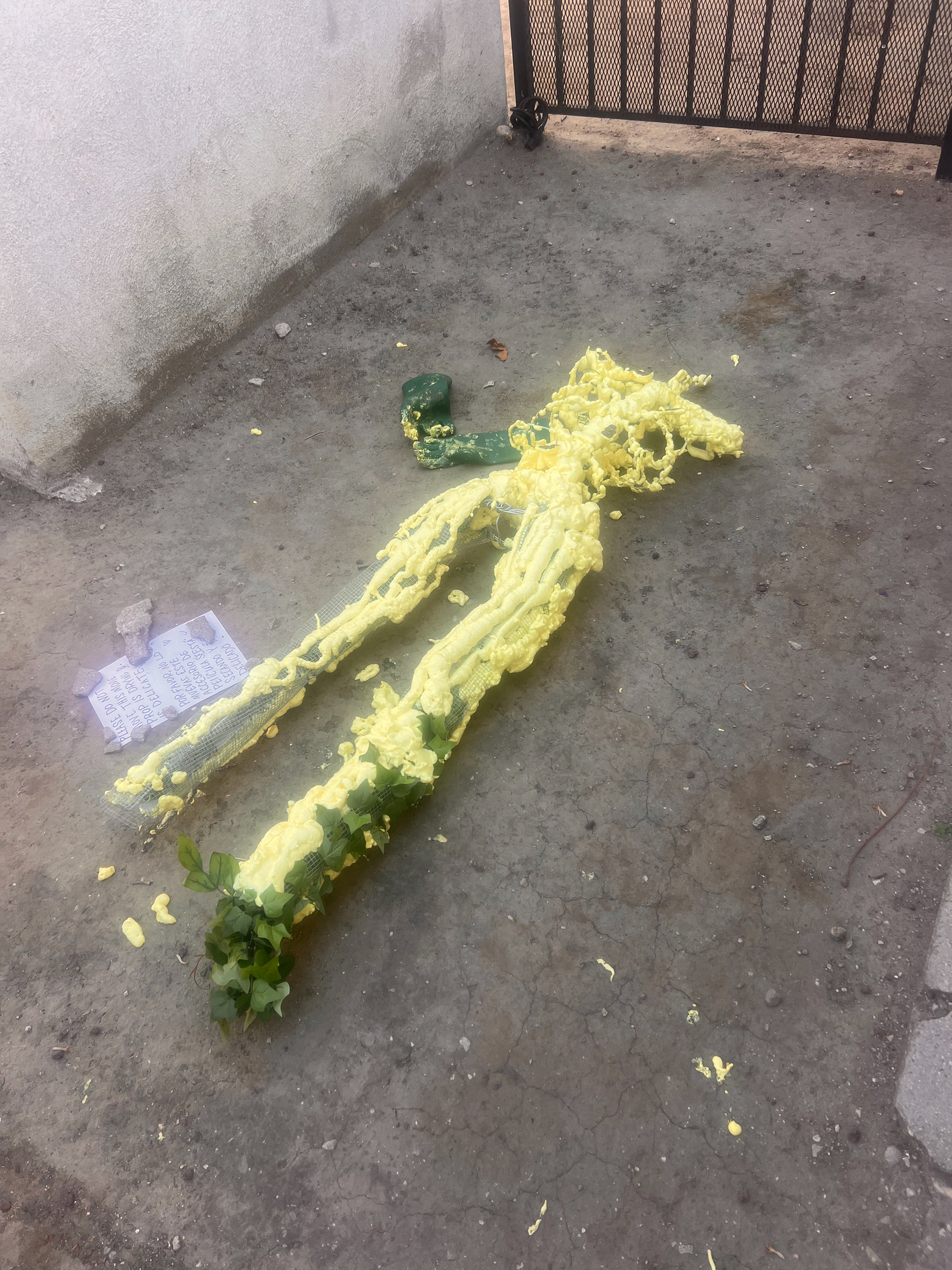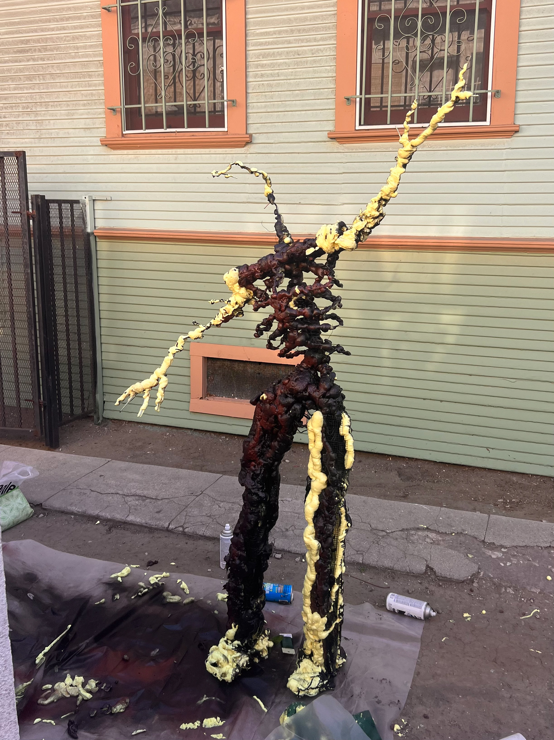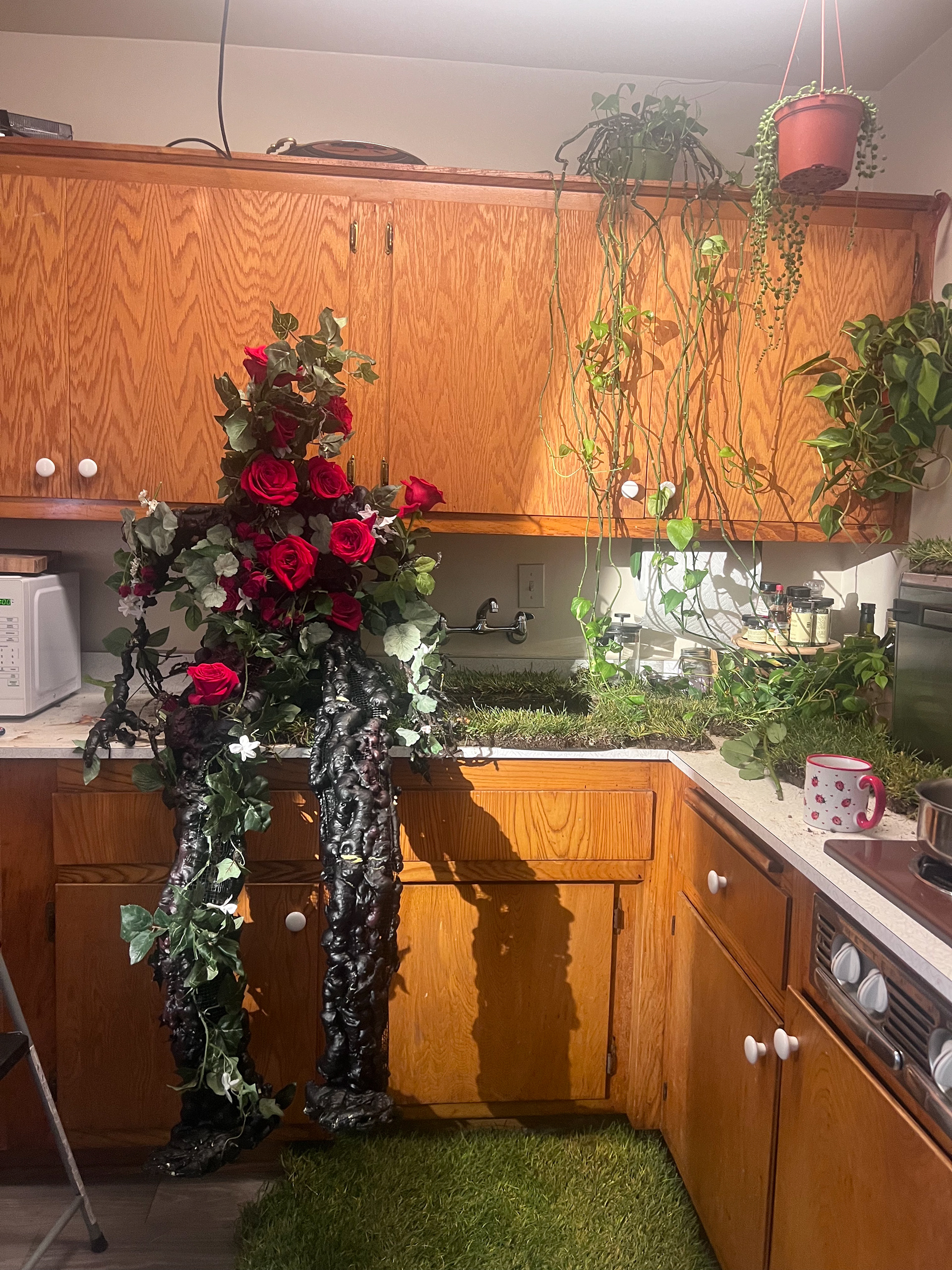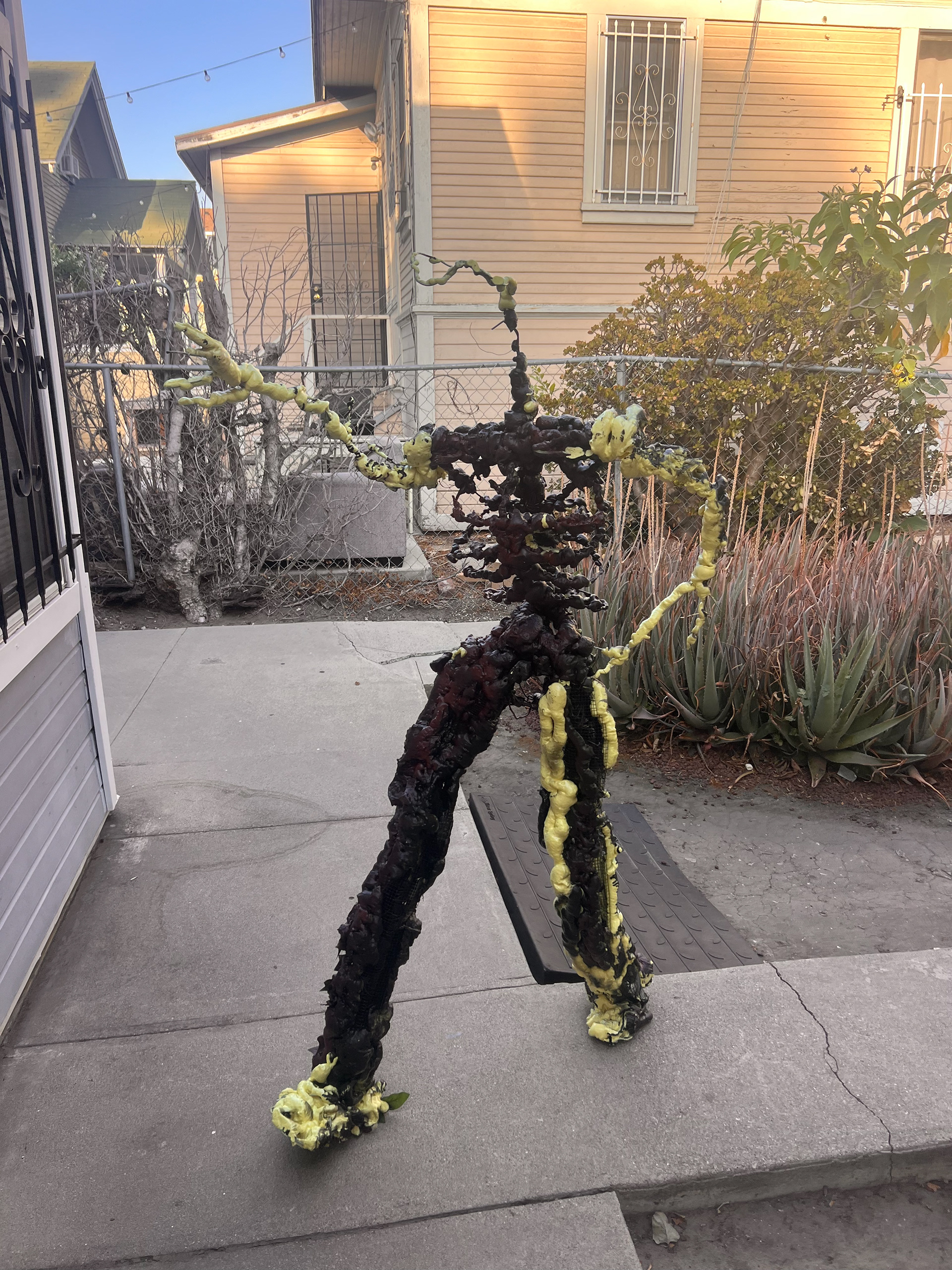 I built this life-sized animatable flower man, capable of sitting, standing, and dancing. It has an armature wire and chicken wire base, with low-expansion polyurethane foam, adorned a mixture and fake and real foliage.