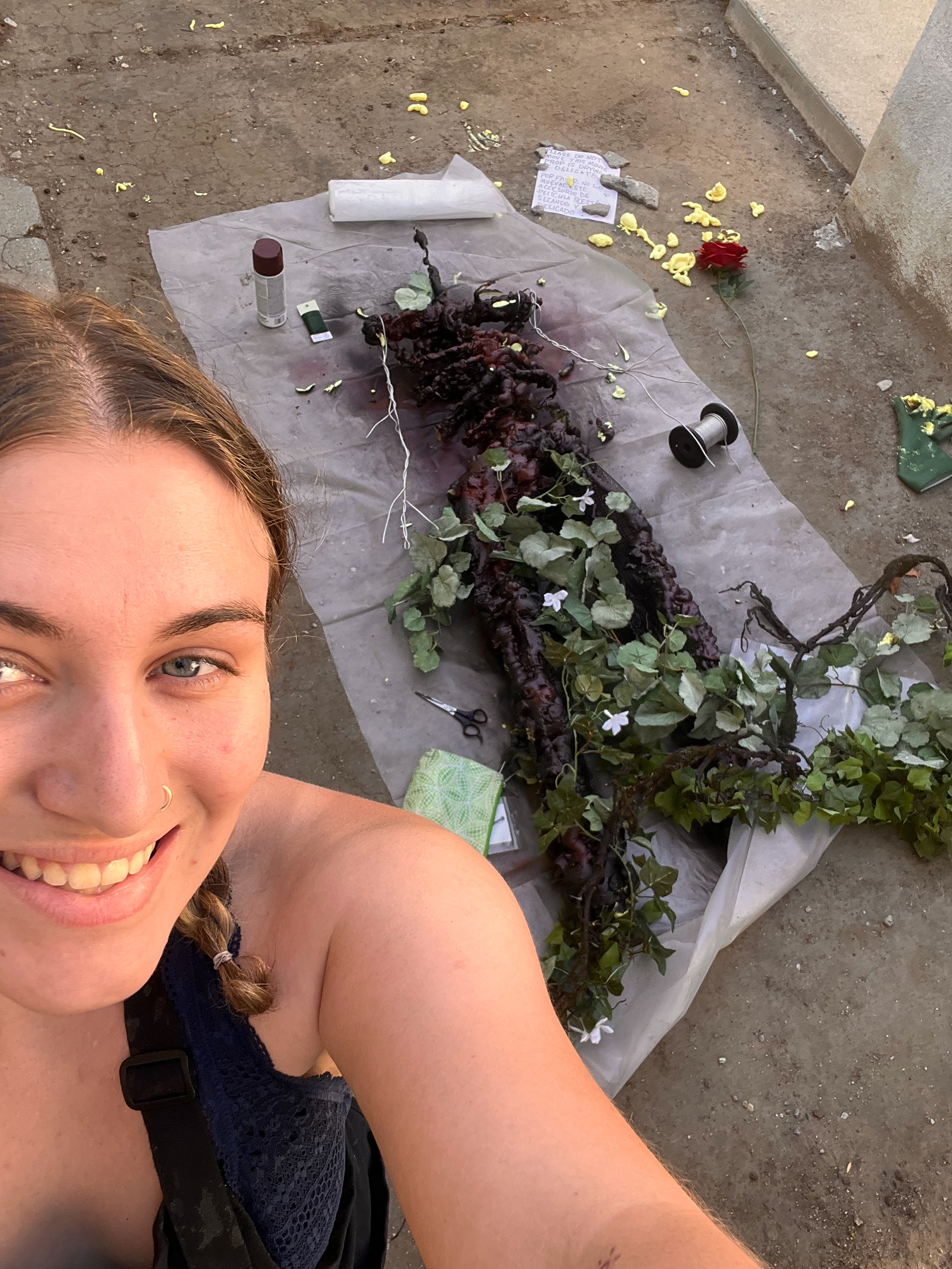 I made dozens of tiny realistic vines for Lizard, Lizard. These are made of the tips of the roots from a shallow-rooted vine, plus its thick and waxy dried leaves cut into smaller pieces, and glued together with UHU. These were durable and flexible.