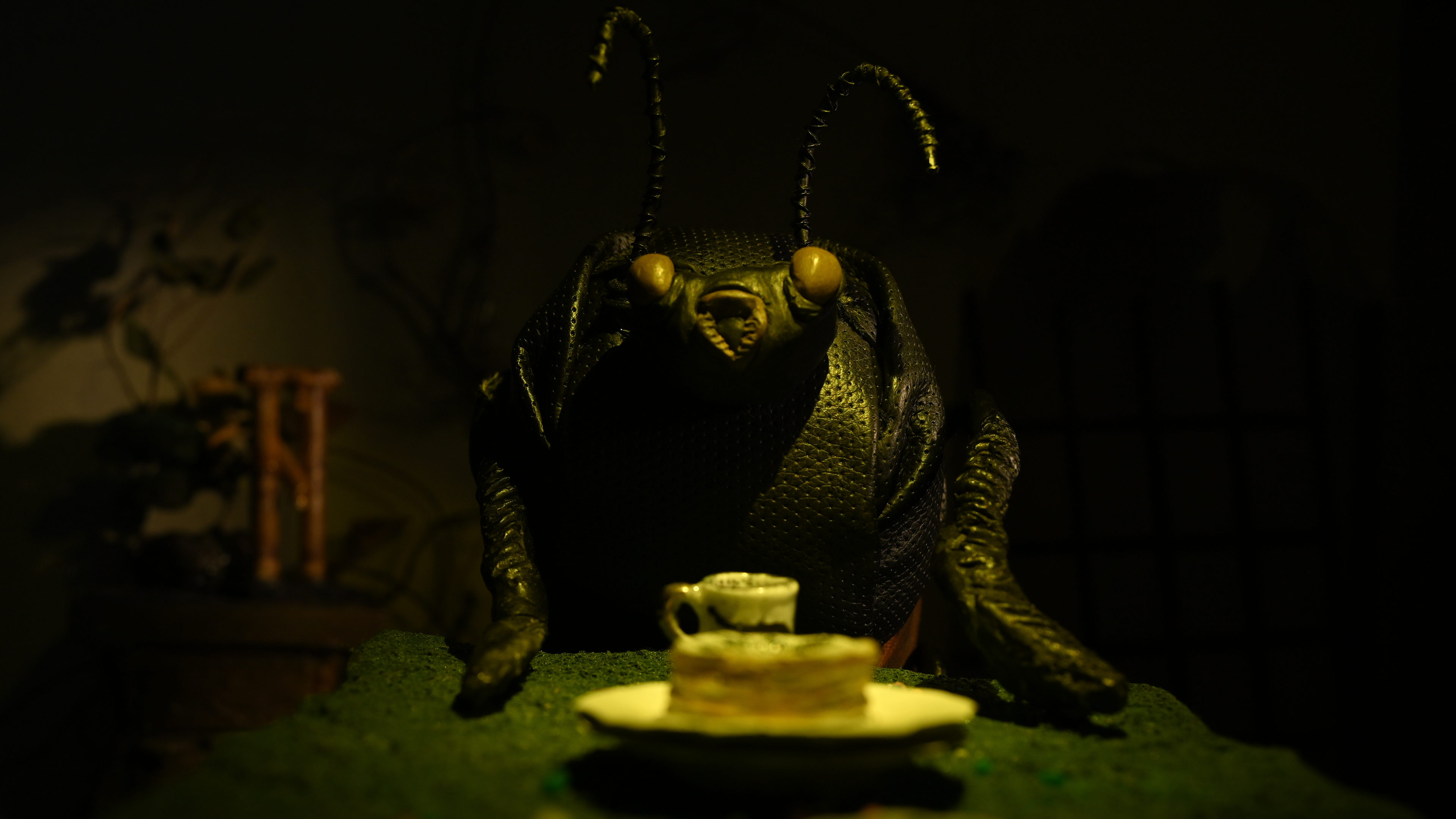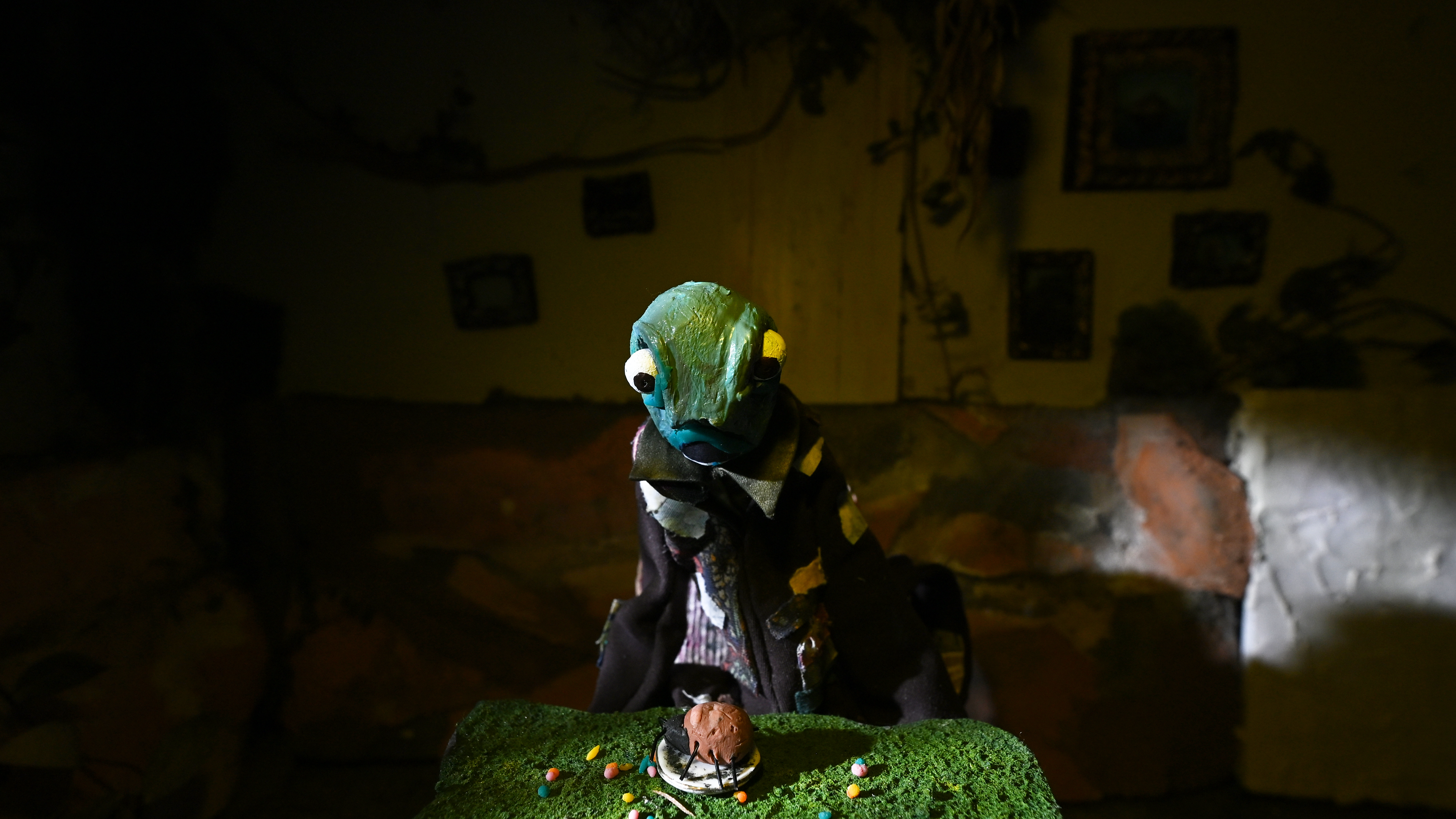 My stop-motion contributions above: Build room (five removable flats), apply textures, color match and paint, make props, paint images inside frames, make foliage, repaint small ceramics, wire practical lighting, set dress.